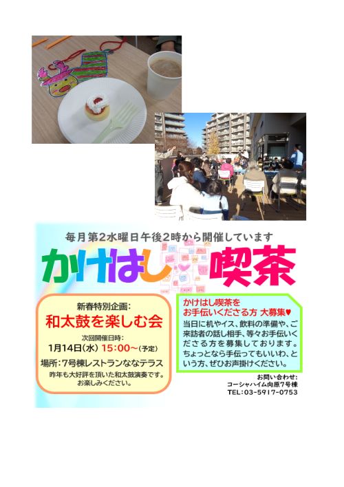 ※来月のかけはし喫茶は1/14(水)15時~和太鼓を予定しております。